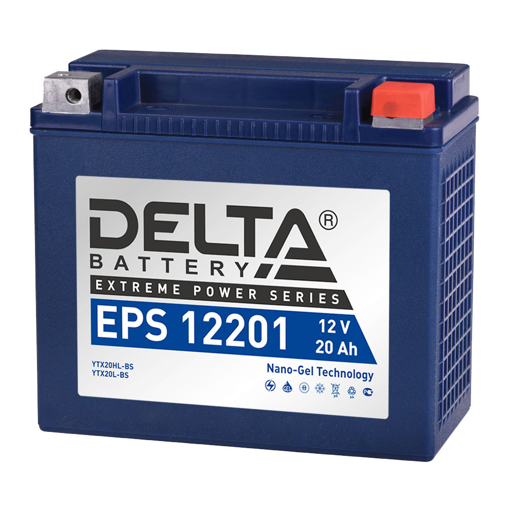 Мото аккумулятор для мотоцикла на мотоцикл DELTA EPS 12201 по данным производителя заменяет собой следующие модели YUASA: YTX20HL-BS, YTX20L-BS. Габариты, мм: 176x87x154. Линейка необслуживаемых стартерных аккумуляторов DELTA EPS 12201 произведена по технологии GEL: в электролит добавлен загуститель, образующий жидкость в гелеобразную субстанцию, а для безопасности оснащены VRLA клапанами. Специфика батарей серии EPS позволяет использовать их для мототехники с увеличенным энергопотреблением: - обеспечивает в 2 раза больший ток холодной прокрутки; - в 4 раза большую устойчивость к циклам заряда/ разряда по сравнению с обычными заправленными АКБ. Технология GEL позволяет эксплуатировать батарею в любом положении, обеспечивает виброустойчивость и герметичность, а усиленные клеммы выдержат протекание самых высоких пусковых токов.