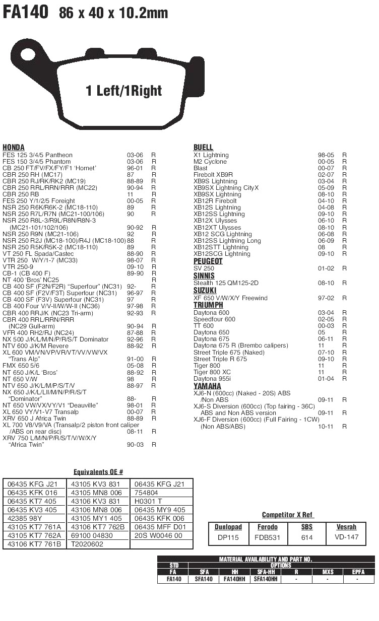 Органические тормозные колодки EBC FA140 предназначены для дорожных, спортивных и туристических мотоциклов и скутеров, полностью удовлетворяют требования производителя к тормозным свойствам и рабочей температуре. Устанавливаются на зад. Имеют хорошую износостойкость и не агрессивны к тормозным дискам. Рекомендованы для использования на дорожных мотоциклах и круизёрах. Органическая серия создана для обычного гражданского применения, посещать на ней треки не рекомендуется.