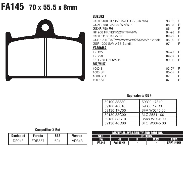 Органические тормозные колодки EBC FA145 предназначены для дорожных и спортивных мотоциклов, полностью удовлетворяют требования производителя к тормозным свойствам и рабочей температуре. Устанавливаются на перед. Имеют хорошую износостойкость и не агрессивны к тормозным дискам. Рекомендованы для использования на дорожных мотоциклах и круизёрах. Органическая серия создана для обычного гражданского применения, посещать на ней треки не рекомендуется.