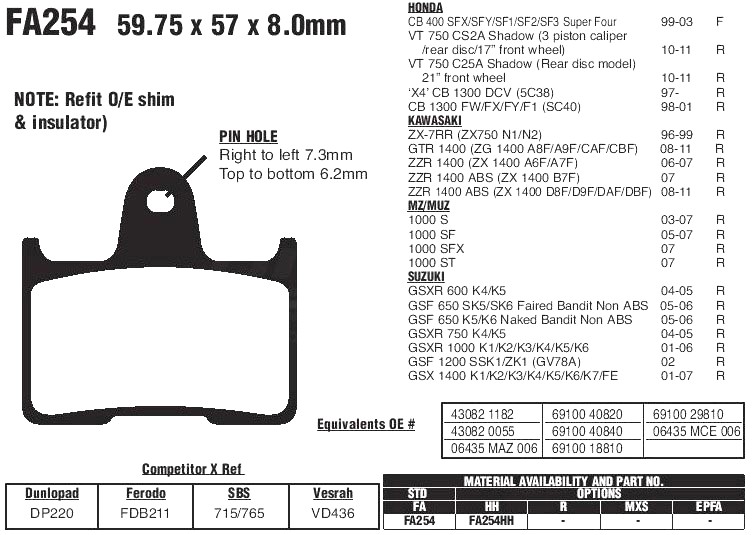 Органические тормозные колодки EBC FA254 предназначены для круизёров, дорожных, спортивных и спортивно-туристических мотоциклов, полностью удовлетворяют требования производителя к тормозным свойствам и рабочей температуре. Устанавливаются на зад. Имеют хорошую износостойкость и не агрессивны к тормозным дискам. Рекомендованы для использования на дорожных мотоциклах и круизёрах. Органическая серия создана для обычного гражданского применения, посещать на ней треки не рекомендуется.