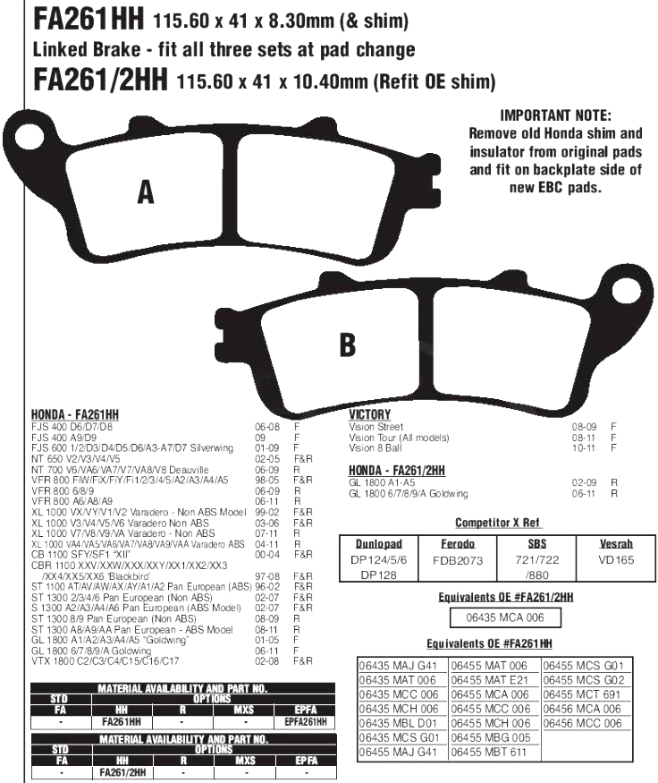 Номер по каталогу производителя: FA261HH Применимость: Для HONDA Колодки тормозные EBC FA261HH DOUBLE H Sintered с ультра высоким коэффициентом трения созданы на основе медного сплава. Обеспечивают отличную эффективность торможения и длительный срок эксплуатации. Рекомендованы для использования на спортбайках, мощных классических мотоциклах и тяжелых крузерах. Эта деталь применяется на мотоциклах следующих моделей (полный список см. на картинках-сканах каталога): F- это ПЕРЕДНИЕ колодки, R- это ЗАДНИЕ колодки.НАПИШИТЕ МОДЕЛЬ И ГОД ВАШЕГО МОТОЦИКЛА И МЫ ПОДБЕРЁМ!HONDA VFR800 98-05 F/R HONDA XL1000 99-06 HONDA CBR1100XX F/R HONDA ST1300 02-07 HONDA GL1800 GOLDWING F HONDA VTX1800 F/R HONDA VFR800 06-11 R И многие другие модели мотоциклов НАПИШИТЕ МОДЕЛЬ И ГОД ВАШЕГО МОТОЦИКЛА И МЫ ПОДБЕРЁМ!